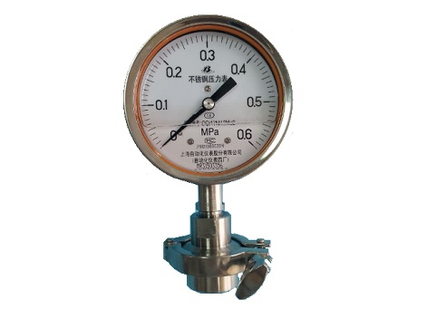 为了防止高粘度、易结晶、易凝固、有固体浮游物的介质压力以及必须避免测量介质直接进入通用型压力仪表和防止沉淀物积聚且易清洗的场合,应必须采用由隔膜隔离器与通用型压力仪表组成一个系统的隔膜压力表,上海自动化仪表四厂生产的Y-100B-FZ/Z/MC卫生型卡箍式隔膜耐振压力表具有装拆快捷方便,易于清洗,不易污染,清洁美观,安全可靠等优点。